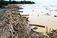 Kayu Gelondongan Hanyut Terbawa Air Sungai Kampar yang Naik
