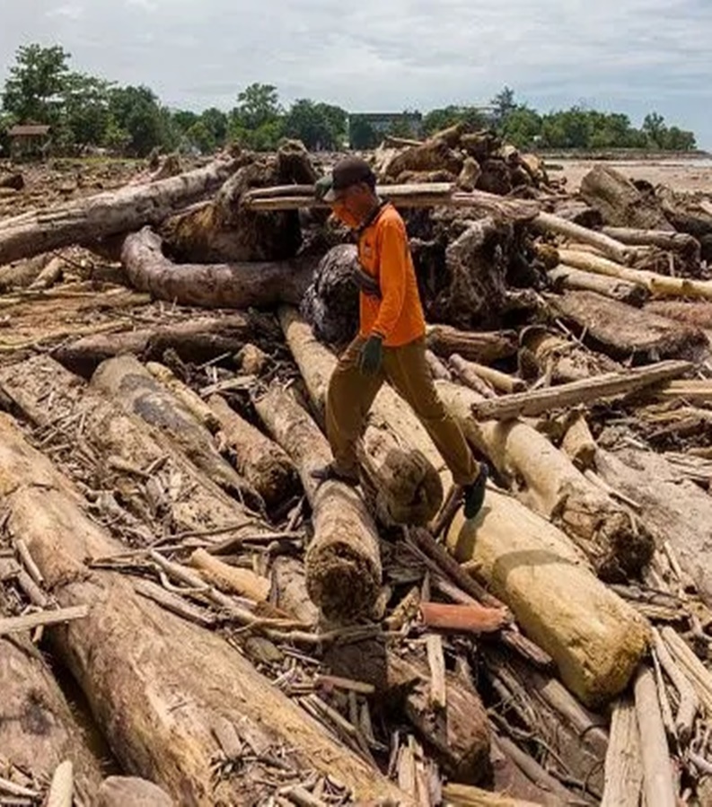 Seseorang melintasi kayu-kayu yang terbawa banjir di Sumatra, Desember 2025.