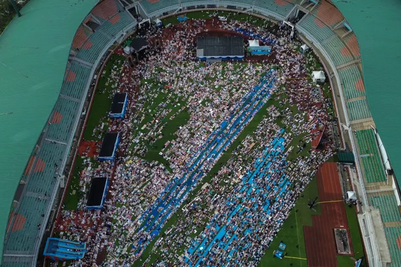 Foto udara umat Islam melaksanakan salat Idulfitri di Stadion Pakansari, Kabupaten Bogor, Jawa Barat, Sabtu (21/03).