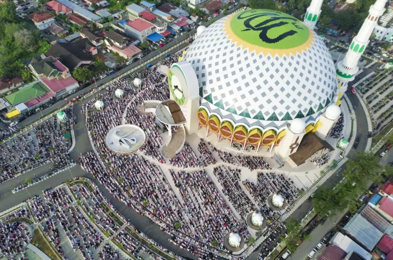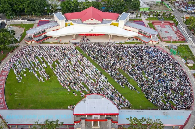 Berikut sejumlah foto salat Idulfitri yang diabadikan di berbagai daerah di Indonesia. Sebagian besar foto diambil menggunakan drone dari udara.