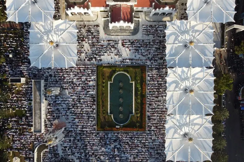 Foto udara umat Islam melaksanakan salat Idulfitri 1447 H di Masjid Raya Baitul Khairaat Palu, Sulawesi Tengah, Sabtu (21/03). Salat Idulfitri di masjid