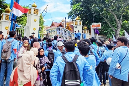 Massa BEM Unri terus berusaha menerobos masuk ke dalam kantor Gubernur Riau melalui gerbang yang berada di Jalan Cut Nyak Dien.