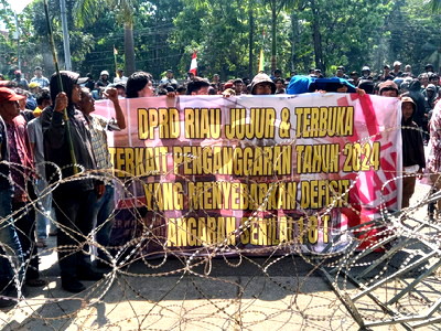 "Harus ada yang bertanggungjawab. DPRD Riau harus menindaklanjuti temuan BPK RI Perwakilan Riau," kata massa yang berdemo.