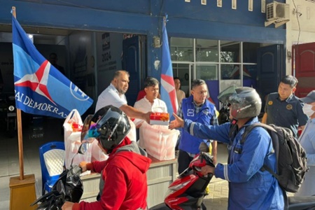 DPD Demokrat membagikan seribu nasi kotak kepada masyarakat Kota Pekanbaru yang melintas di kantor DPD Demokrat Riau di Jalan Arifin Ahmad, Jumat (20/2/2025).