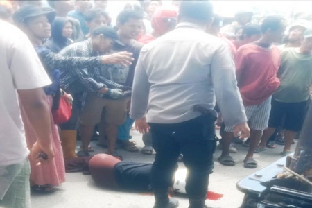 Pantauan di lokasi terlihat korban mengenakan kaos berwarna hitam dan celana cokelat, serta menggunakan helm putih. Darah tampak mengalir di sekitar kepala korban.