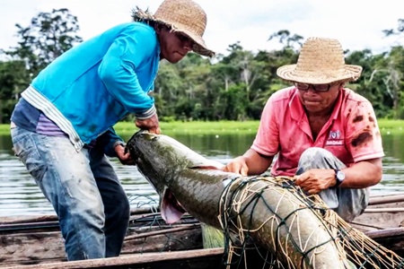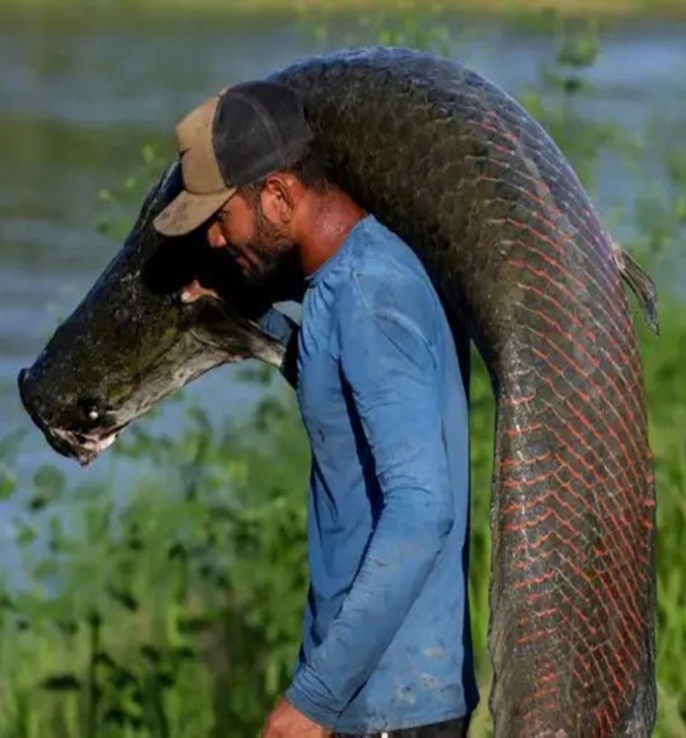 Ikan hasil tangkapannya yang dimaksud adalah pirarucu, atau arapaima, ikan raksasa yang hidup di sungai Amazon.